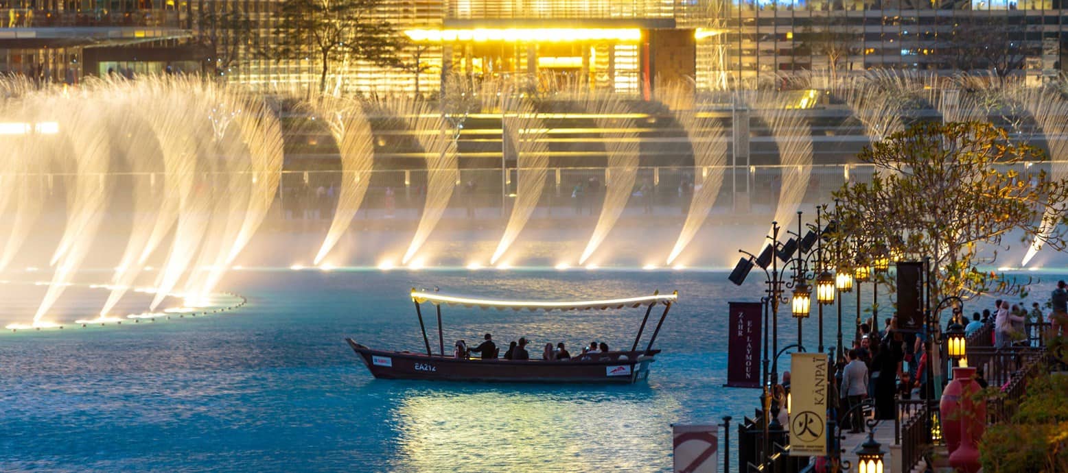 Чтобы превратить вечер в романтическое свидание, можно забронировать место на плавучей платформе Dubai Fountain Boardwalk, которая находится всего в 9 метрах от фонтана. Или подплыть к нему вплотную на лодке — эта услуга называется Dubai Fountain Lake Ride.